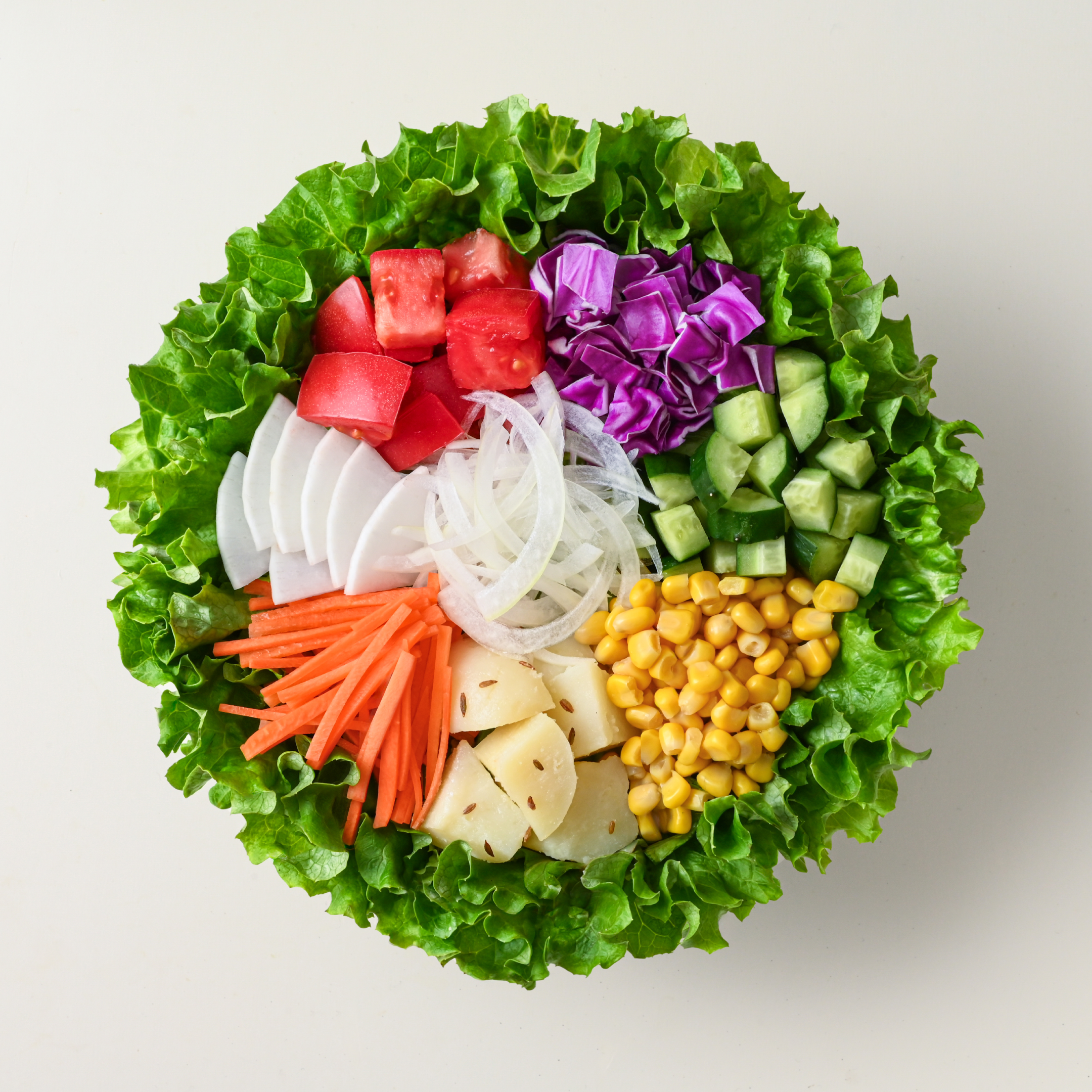 ・당근・무・토마토・보라색 양배추・오이・옥수수・감자구이・양파