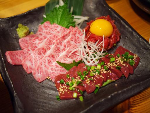 牛刺し盛り合わせには、さまざまな部位をバラエティ豊かに盛り付けます。肉の質感と風味を最大限に引き出すため、特別な調理法や味付けは施しておりません。お客様自身で、肉本来の美味しさを存分にご堪能ください。