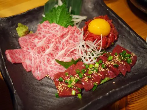 牛刺し盛り合わせは、お好みに合わせて添える調味料と一緒に提供されます。わさびと醤油を付けてお召し上がりください。