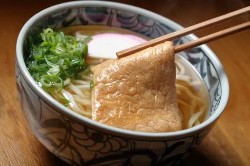 甘く煮た油揚げをのせた温かいうどんです。